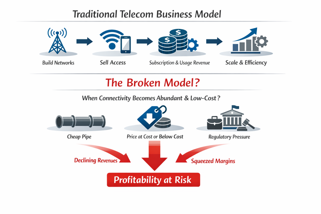 As seen in the diagram, for most of telecom history, the core business model has been simple: Build networks Sell access to those networks Recover capital (revenue) through subscription and usage revenues, and Protect margin through scale and operational efficiency But what happens if (when? after?) that model breaks? What happens if connectivity becomes so […]