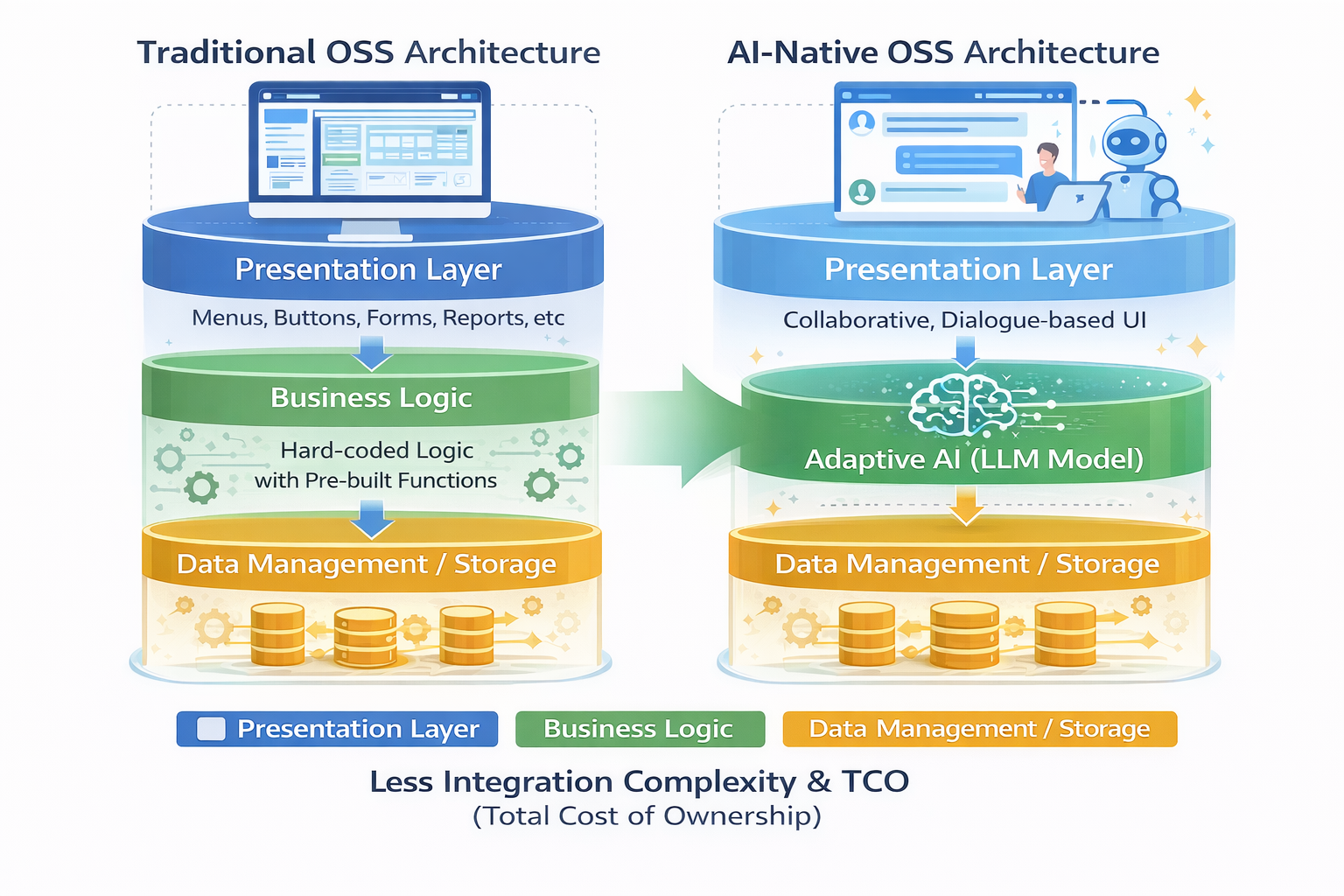 The fact that both of these videos are built around AI-centric interaction models is important because it allows us to envisage an OSS UI (User Interface) that doesn’t have complex menus, buttons, screens, pick-lists, etc, like legacy OSS. Nor does it need a load of functionality baked into the logic layer unnecessarily. It allows us instead to focus on how the data layer interacts with these new-style interfaces and workflows on top. This concept is partially described in the table below, but is further elaborated on in our earlier article, “Do you know what the most widely used OSS/BSS application is?”