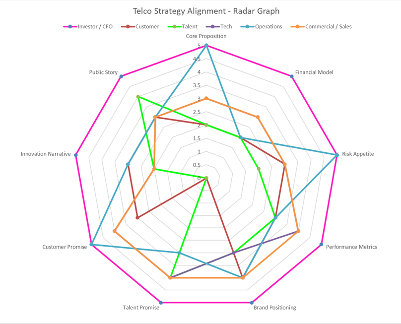Below is the attempt at a heat-map and radar chart of how I’d map the alignment (1 = low, 5 = high) between each functional worldview across the key strategy dimensions. The CFO’s world-view is 5 (green) on each dimension and everyone else’s level of alignment with the CFO perspective is measured on a heat-map (yellow = 4, orange = 3, red = 2 and white = N/A):